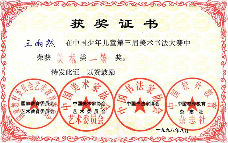 This is certified that YURAN WANG is awarded the first prize in the Third China National Viaual Art Competition for kids and teenagers in August of 1998.