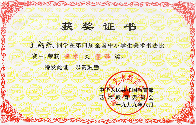 This is certified that YURAN WANG is awarded the first prize in the Fourth China National Visual Art Competition for kids and teen a gers in August of 1999.