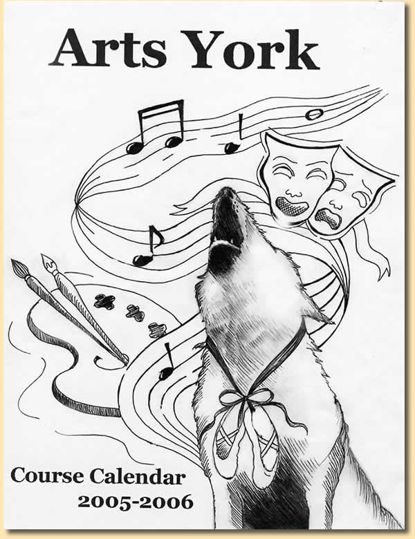 I was nominated to design a cover for the 2004-2005 Arts York course calendar. This cover reflects the four unique disciplines of Arts York extensive program that Unionville High School offers, including visual art, dance, music and drama. The calendar cover design shows the mascot of the school and symbols of each department of Arts York. The design is shown below: |